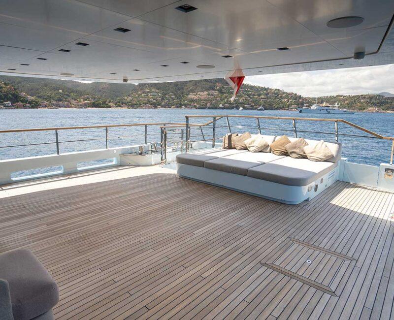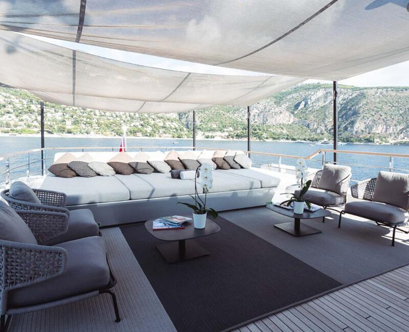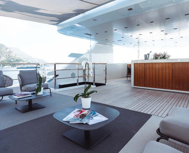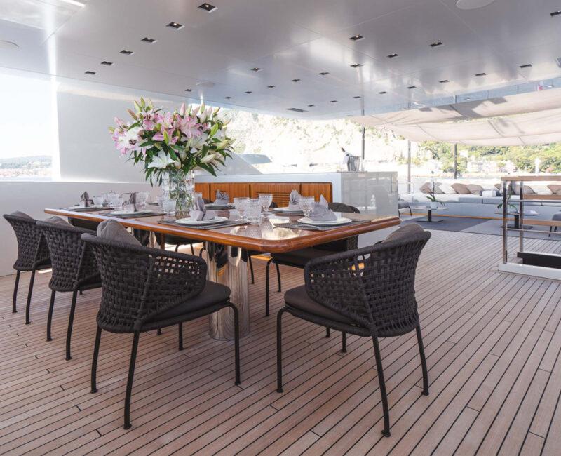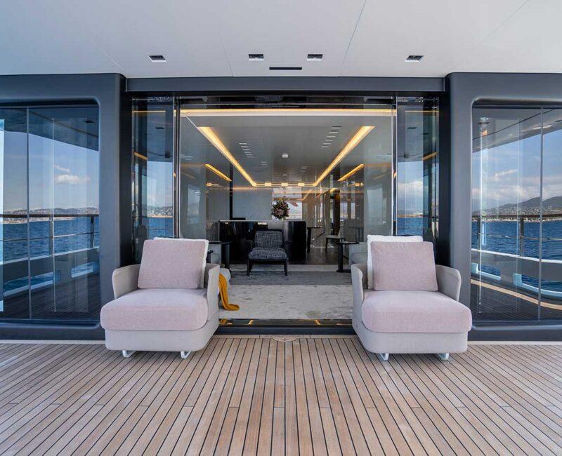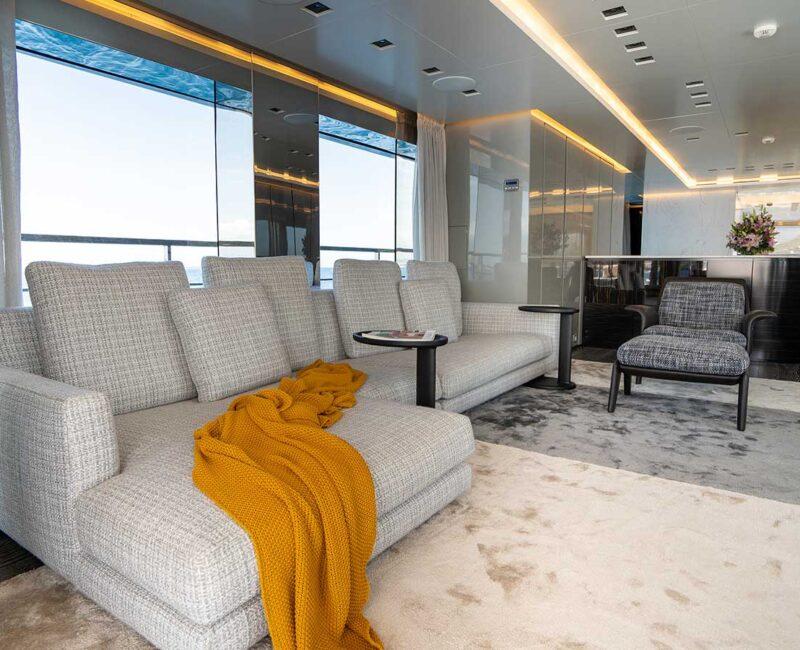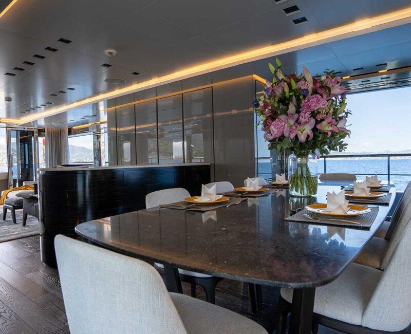 Delivered in 2017, JESMA II establishes a visually appealing and cozy setting for guests to unwind and engage in entertainment. With nearly floor-to-ceiling windows in the main salon and dining areas, an abundant influx of natural light permeates the space throughout the day. The impressive incorporation of glass serves to highlight the yacht's expansive interior volume, enabling guests to appreciate the surrounding cruising grounds while enjoying the climate-controlled comfort provided by the air conditioning.