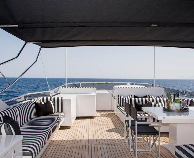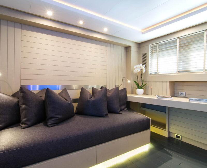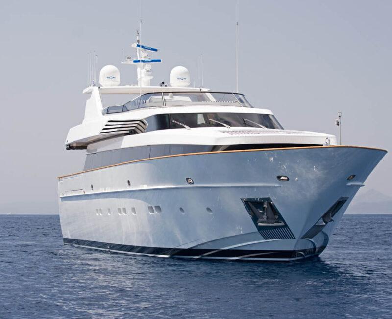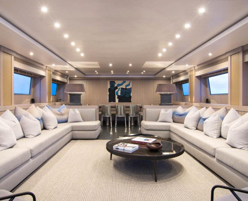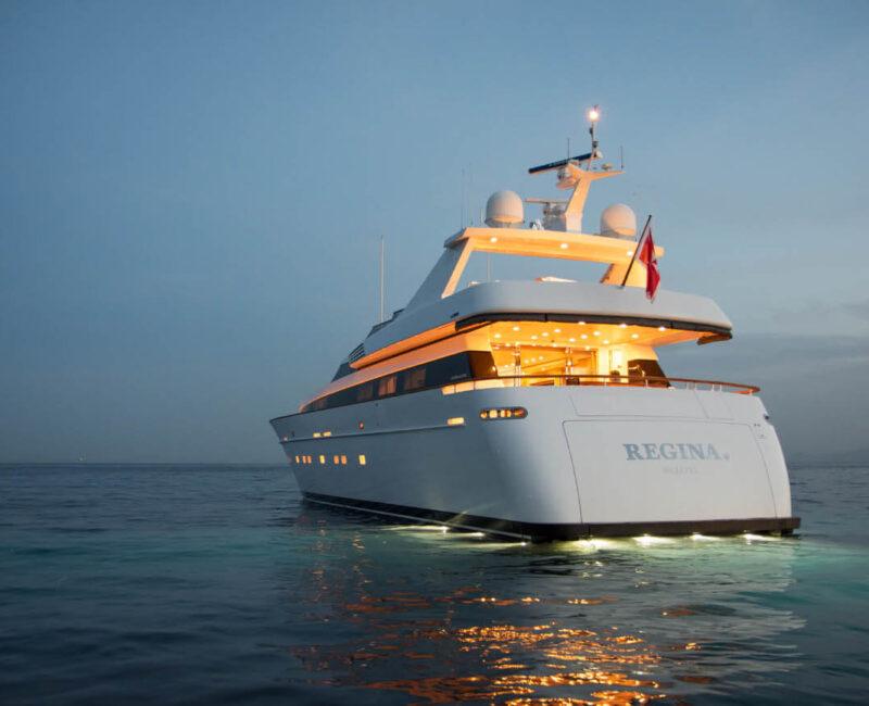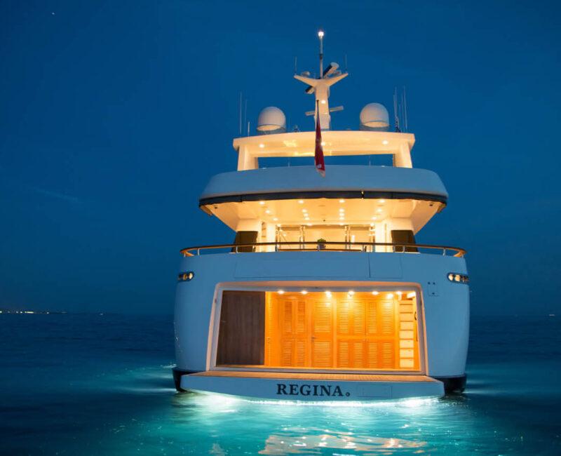 Bbuilt in 2008 by Cantieri di Pisa and refitted in 2018, REGINA K can accommodate 10 guests in 5 cabins including 1 Master, 2 Double, 1 Twin cabin with pullman berth and 1 Twin, all with en-suite facilities. Her cruising speed is about 20 knots and she offers a crew of 5. The interiors from internationally recognised Francesco Paszkowski use a pale colour scheme with light natural wood panelling and floors. The formal dining area and salon combine to form one large interior. A stern sofa provides a casual outdoor space for guests to unwind in the shade, while on the Foredeck a row of sunpads creates a comfortable sunbathing area with uninterrupted views.The lower deck has a deep swim platform that connects through to the beach club, through which guests can access the Main Deck.