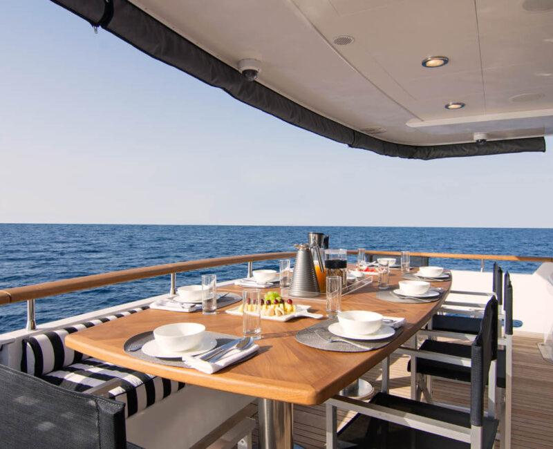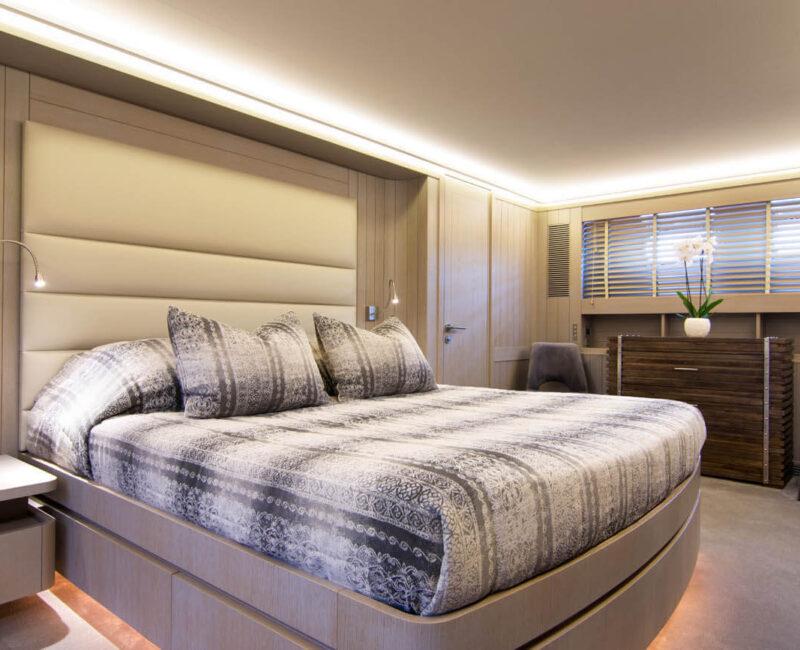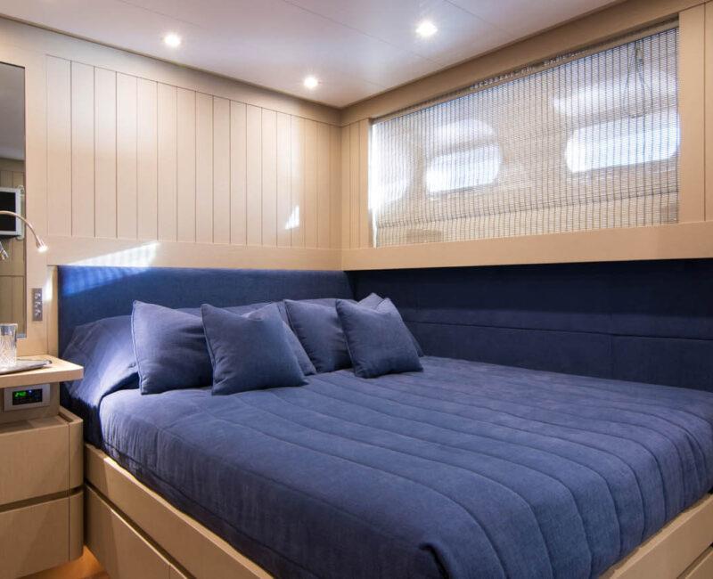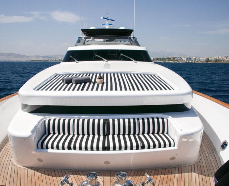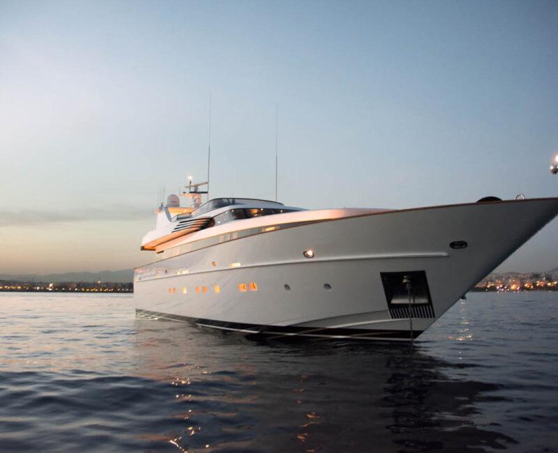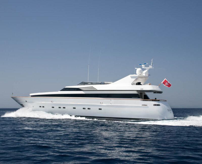 Bbuilt in 2008 by Cantieri di Pisa and refitted in 2018, REGINA K can accommodate 10 guests in 5 cabins including 1 Master, 2 Double, 1 Twin cabin with pullman berth and 1 Twin, all with en-suite facilities. Her cruising speed is about 20 knots and she offers a crew of 5. The interiors from internationally recognised Francesco Paszkowski use a pale colour scheme with light natural wood panelling and floors. The formal dining area and salon combine to form one large interior. A stern sofa provides a casual outdoor space for guests to unwind in the shade, while on the Foredeck a row of sunpads creates a comfortable sunbathing area with uninterrupted views.The lower deck has a deep swim platform that connects through to the beach club, through which guests can access the Main Deck.