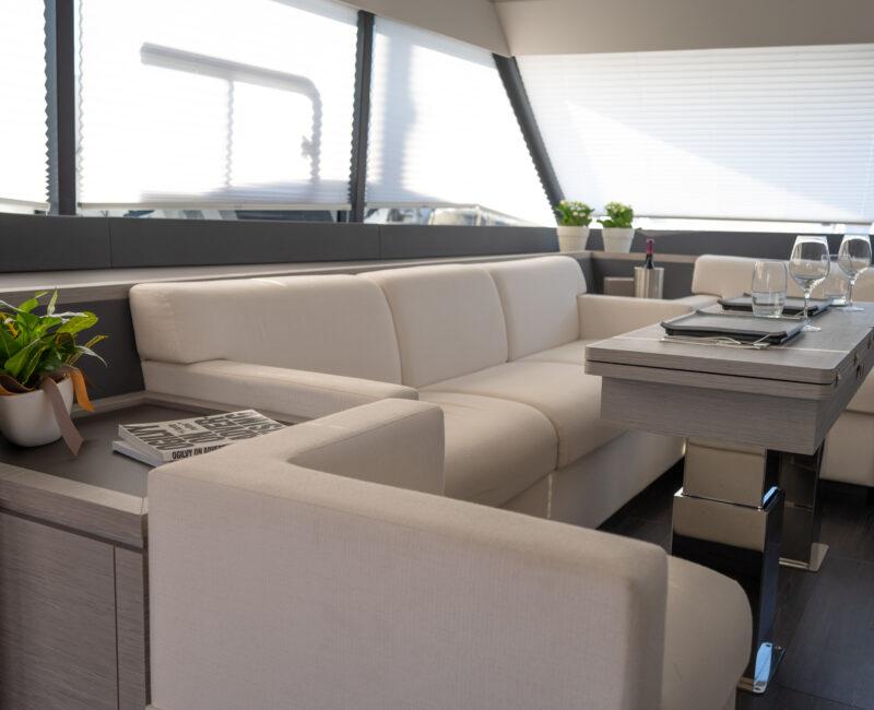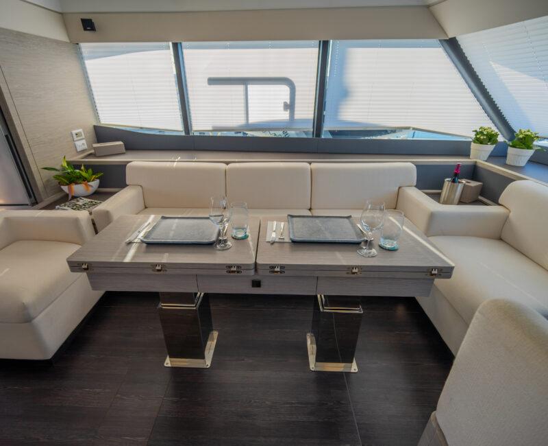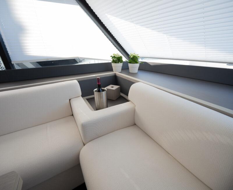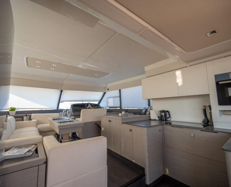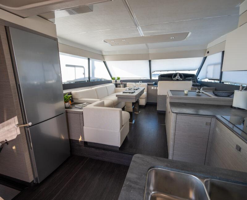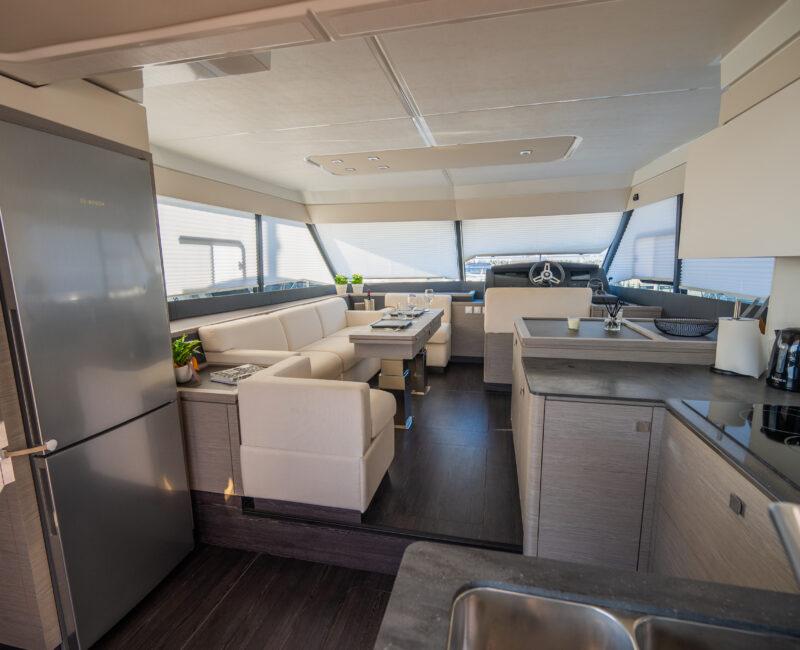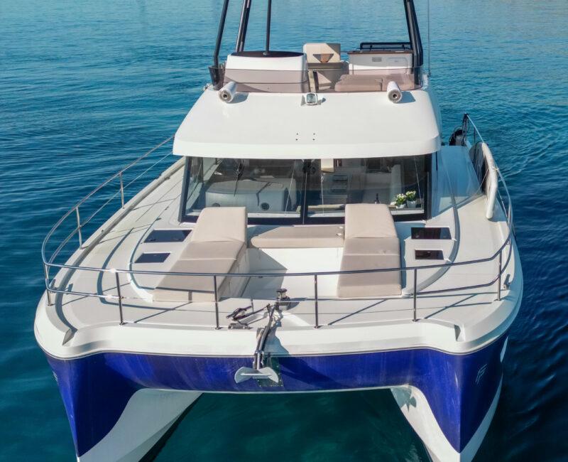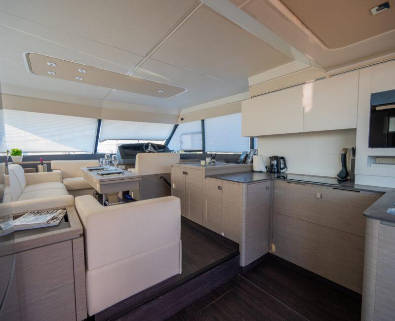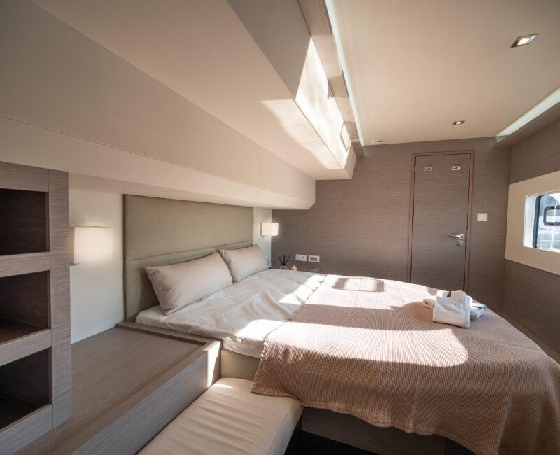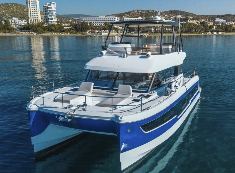 HighlightsA Luxury Power Catamaran with a spacious Flybridge with dining space up to 6 guests. Expansive Cockpit & Foredeck Lounge with a panoramic saloon offering a 360° view. Premium Accommodations and efficient Performance – Powered by twin Volvo IPS 600 engines, cruising at 18-24 knots. Perfect for long range cruises. It Feattures a very spacious layout and a hydraulic swim platform